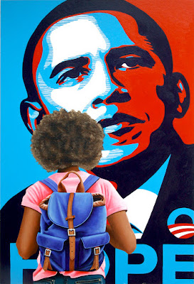 Even though I'm Dutch it makes me miss the eloquence of Obama. So much so that it inspired me paint this painting of a young woman enjoying the well known print of Obama by Shepard Fairey. Sure hope you enjoy it!